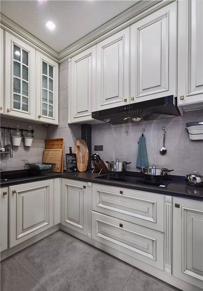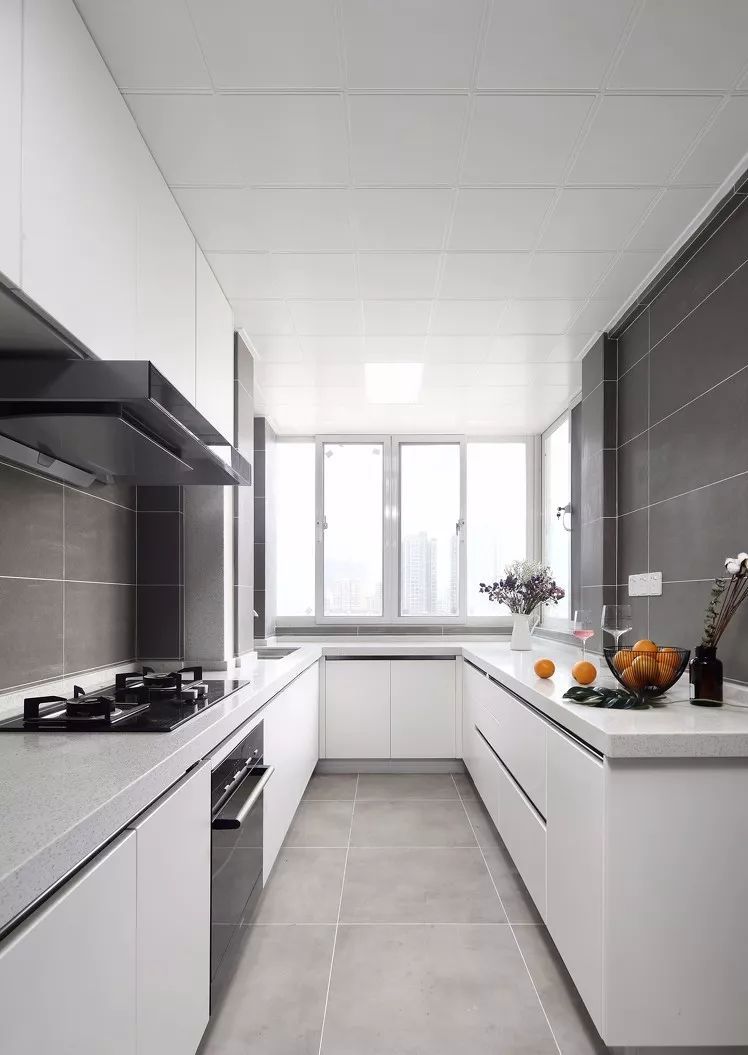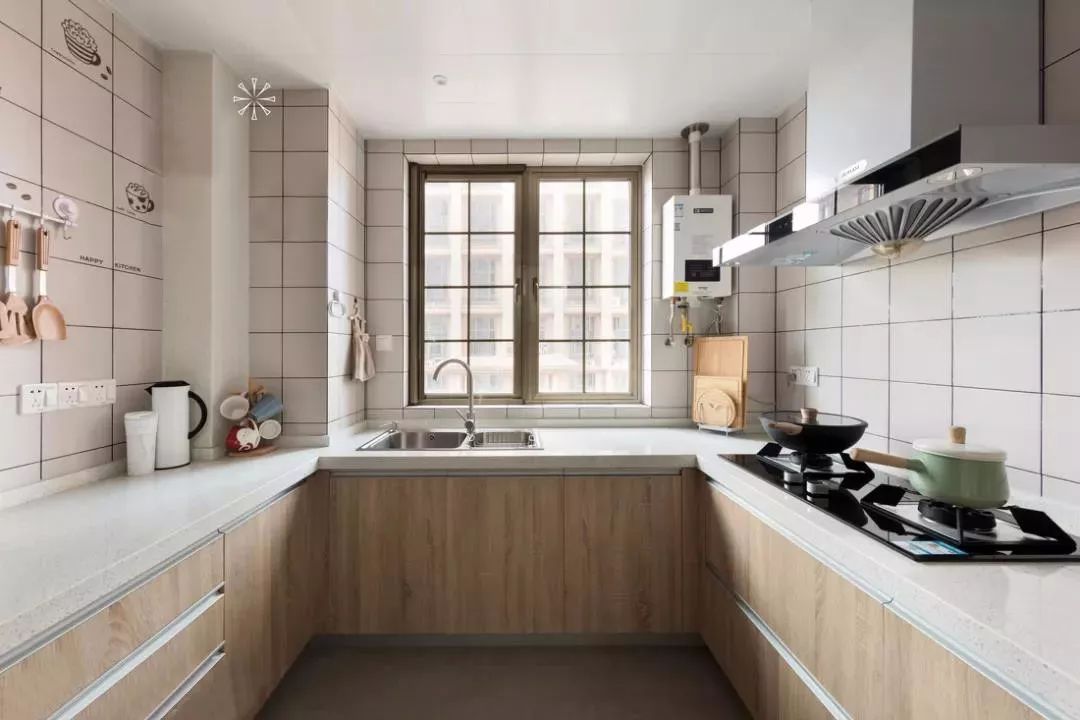 如果你家廚房戶型方正,就很適合U型布局。U型布局儲(chǔ)物功能強(qiáng)大,水槽設(shè)置在U型中間,符合人體工程學(xué),在做飯的時(shí)候炒菜、切菜及常用工具都可以放在左右兩側(cè),非常方便。