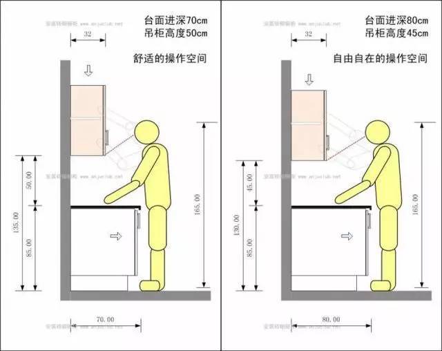 如果櫥柜進(jìn)深為70cm,吊柜距離操作臺(tái)高度可以降低到50cm左右,操作的舒適度和視線上都有較好的提高;如果櫥柜進(jìn)深為80cm,吊柜距離操作臺(tái)高度可以降低到45cm左右。