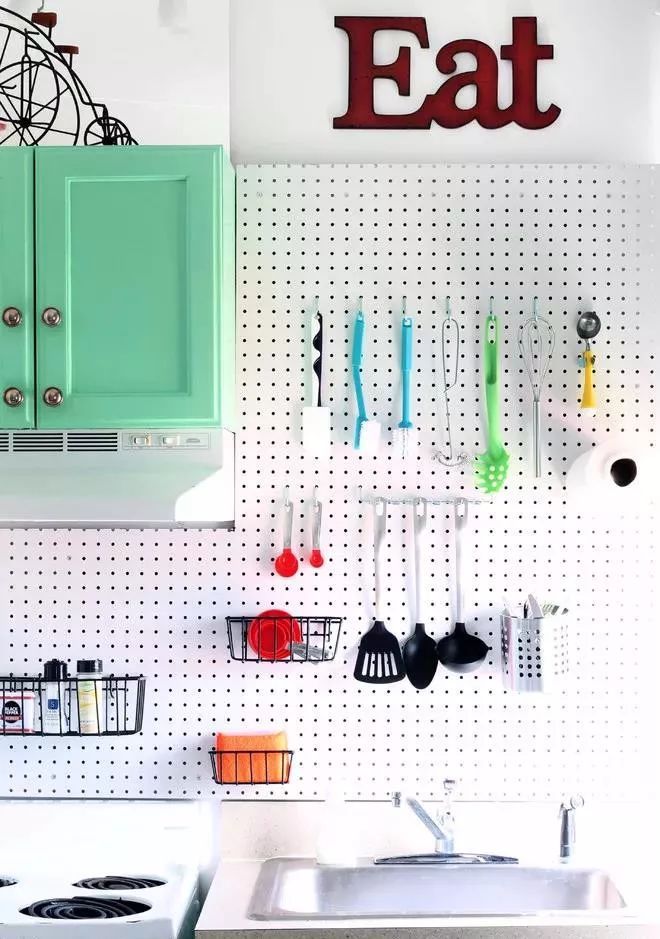 墻面做打孔式的掛鉤板,就是時(shí)下非常流行的“洞洞板”。上面的掛鉤可以隨意移動(dòng),懸掛鍋鏟勺子什么的,也是很好地利用了墻面空間,把臺(tái)面空間釋放出來。