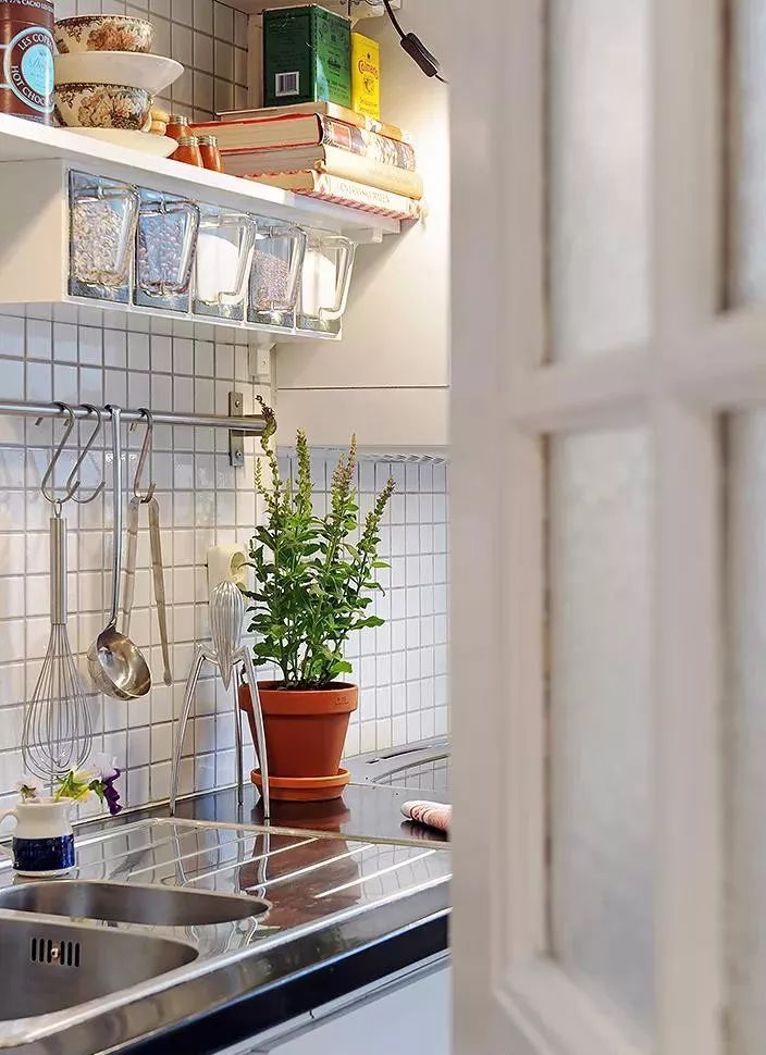 在墻面上安裝幾根不銹鋼管,把常用的鍋?zhàn)印㈢P子、簡(jiǎn)單的工具用掛鉤上墻,不但大大節(jié)省了桌面空間,而且也方便瀝水保持干燥。