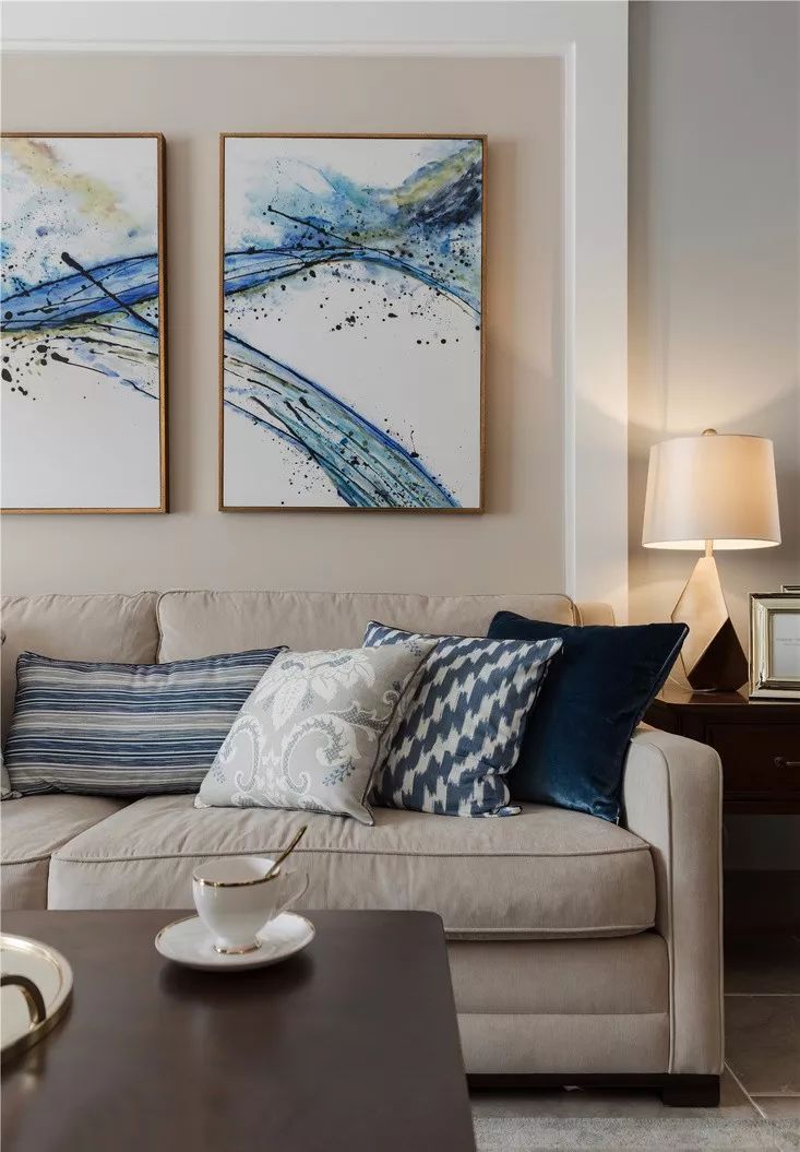 ▲ 藍(lán)色窗簾搭配藍(lán)色裝飾畫(huà),與藍(lán)色抱枕相呼應(yīng),為沉靜的客廳帶來(lái)一絲活潑。