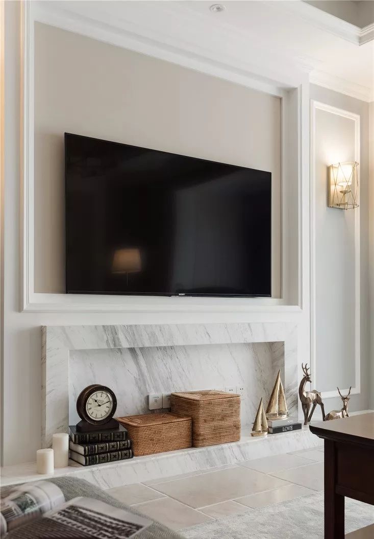 ▲ 電視背景墻以考究比例分隔,并將電視圍合,提升空間感。大理石高級(jí)紋理的加入,帶來(lái)一種自然清冽的藝術(shù)之氣。