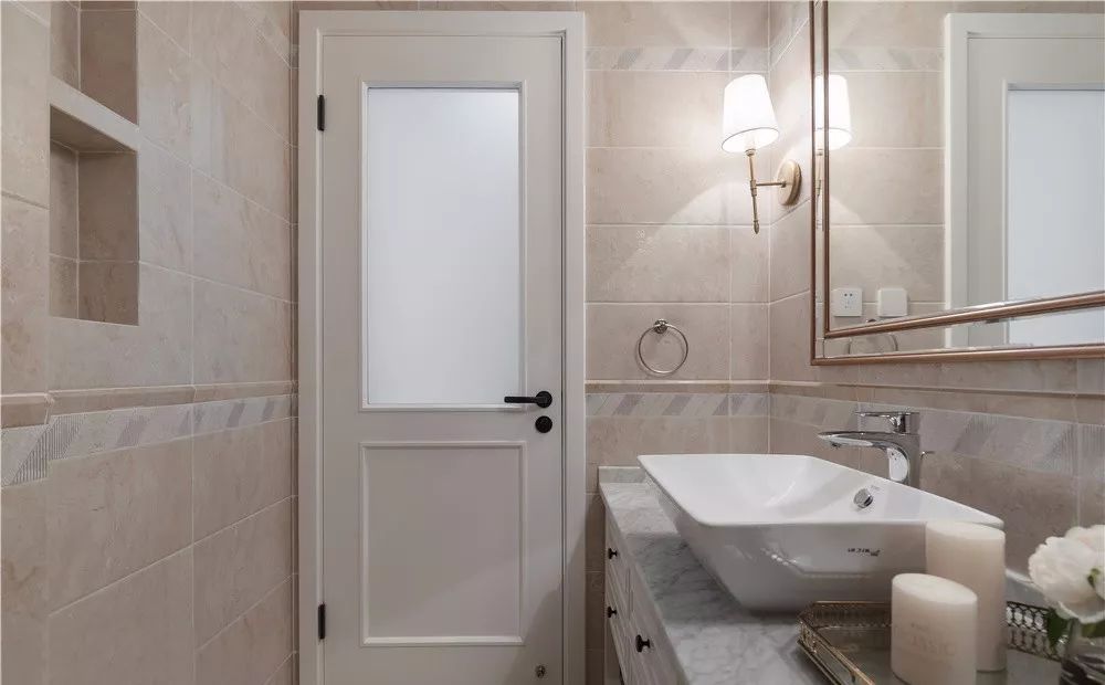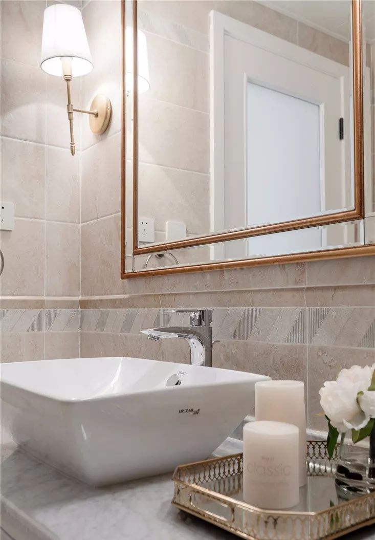 ▲ 浴室以淺色為主,加上銅質(zhì)邊緣的浴鏡,從視覺(jué)上擴(kuò)大了衛(wèi)生間的空間范圍。