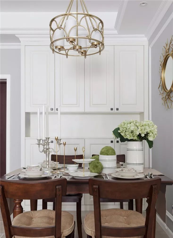 ▲ 餐廳墻面鏡子也帶有美式元素,餐桌擺放精致的餐具和燭臺(tái),一同營(yíng)造輕奢雅致的氛圍。