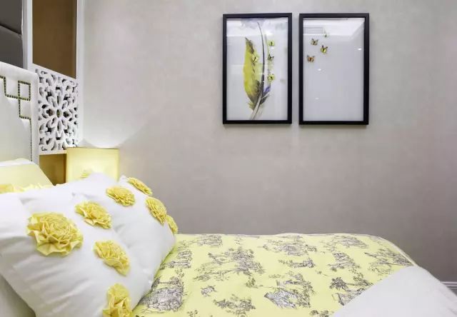 墻面掛上兩幅花蝶與羽毛的裝飾畫,呈現(xiàn)出一幅無限想象的空間畫面。