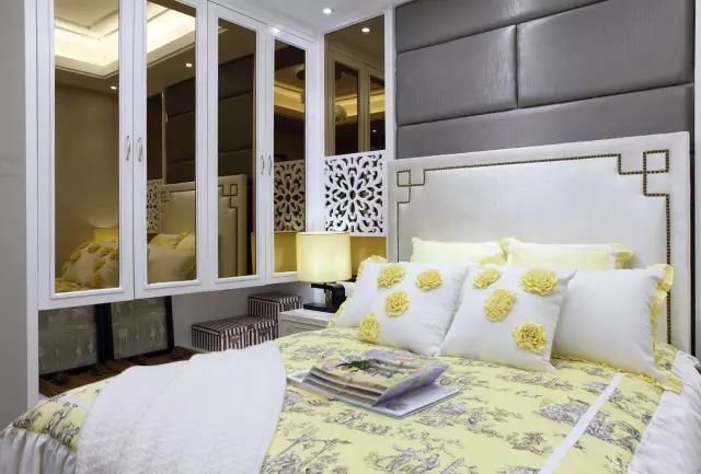 次臥在床頭背景墻以軟包裝飾,兩側(cè)是屏風(fēng)+銅鏡的搭配讓空間顯得更加寬敞。