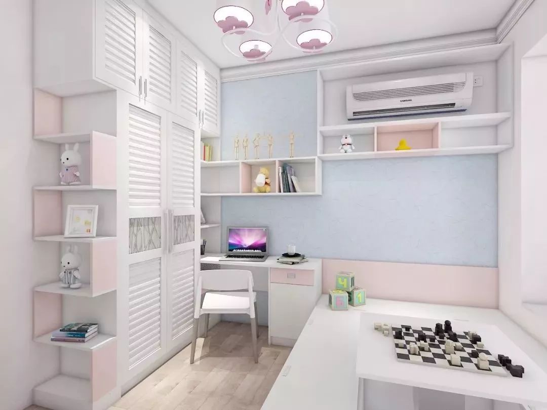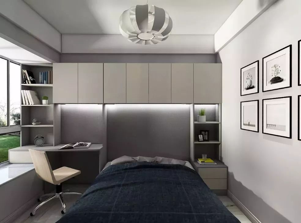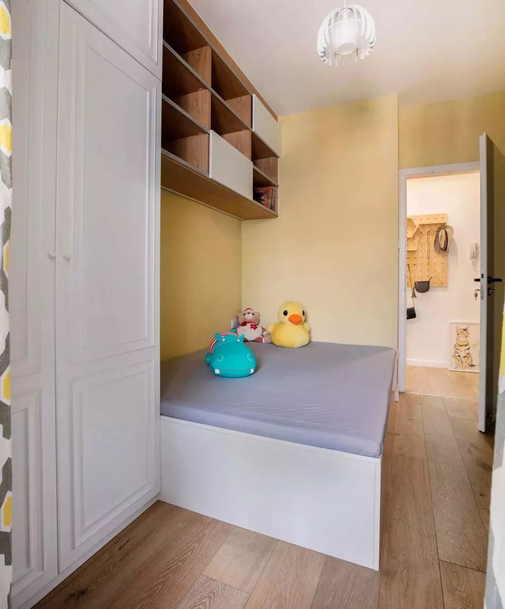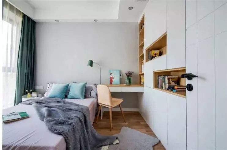▲兒童房里可以搭配臥床,帶孩子挑了他喜歡的床品。書柜和衣柜連在一起,讓儲物也變得簡單起來,孩子還能有個屬于自己的學習角落。單人小床并不會占太多的空間,留出的空間還可以放一個懶人沙發(fā)呢!飄窗下也做了比較實用的收納抽屜,不讓空間白白浪費。