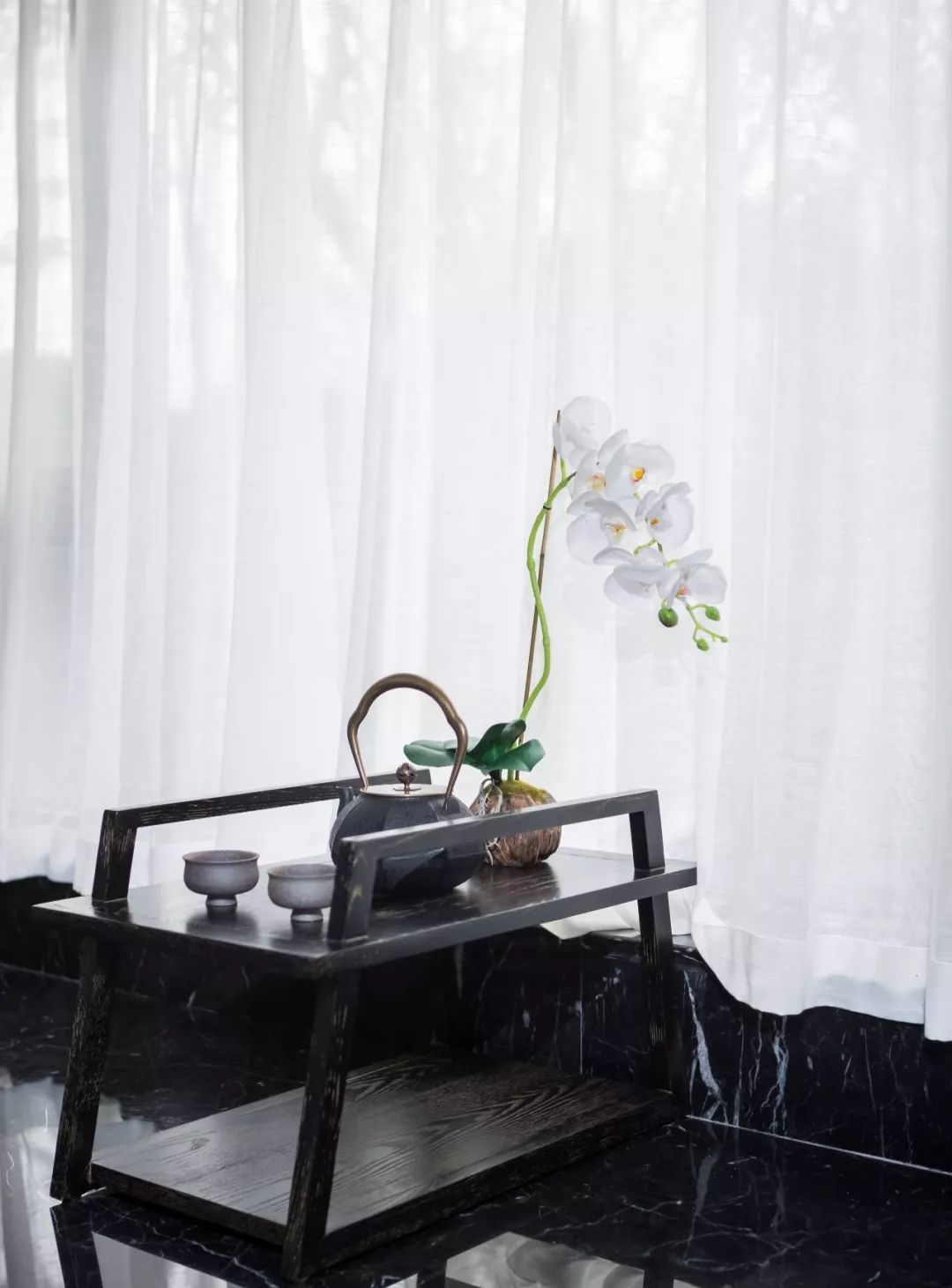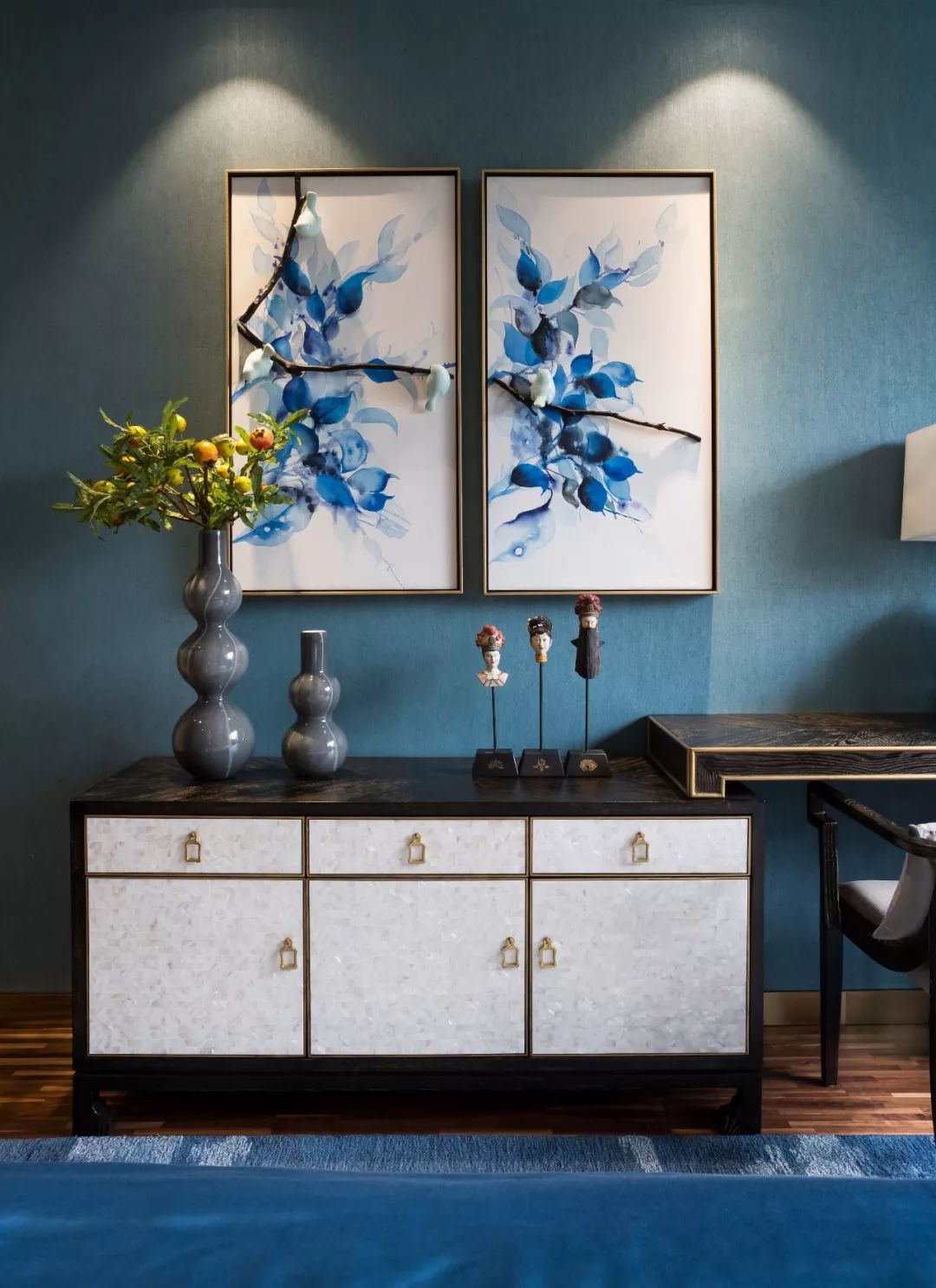 空間上,設(shè)計師以巧妙的設(shè)計手法充分展現(xiàn)出靜、雅、秀、逸的和諧韻味,以白色及藍色為基調(diào),節(jié)制而內(nèi)斂。藝術(shù)品的選擇及文化哲學的高超運用皆體現(xiàn)了點、線、面嚴謹?shù)膶Ρ群魬?yīng)。