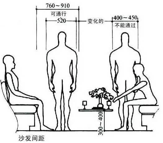當(dāng)沙發(fā)上坐人時(shí),其他人若能正常通行,那么茶幾與沙發(fā)較為適宜的距離為 760-910mm。