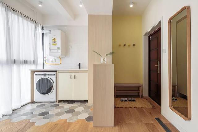 ▲原本較大的入戶花園,在大門靠窗之間做一個(gè)矮柜+高柜的鞋柜,高柜隔斷出洗衣區(qū)與換鞋凳,而矮柜則是作為玄關(guān)與晾衣區(qū)的隔斷,保持透光的基礎(chǔ)又獨(dú)立的空間功能,實(shí)用優(yōu)雅好自然。在換鞋后方裝上掛鉤,側(cè)邊的墻面也裝了一面全身鏡,整個(gè)空間簡(jiǎn)潔實(shí)用的氛圍,令人愜意舒適。