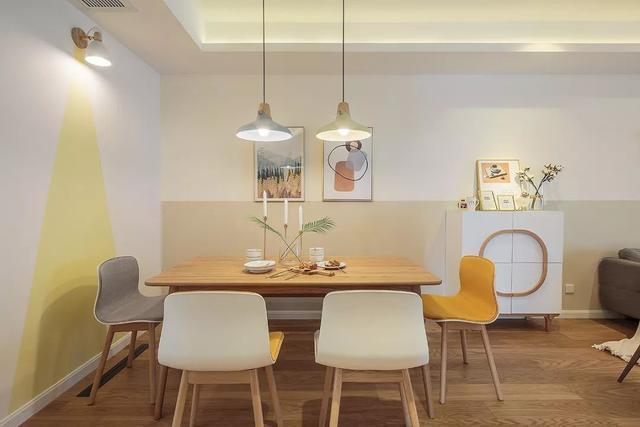 ▲餐廳側(cè)邊的墻面也是加入了一個(gè)三角形的黃色雜色乳膠漆墻面,簡(jiǎn)約有趣的墻面,搭配上清新舒適的餐桌椅布置,置身其中你能感受到滿滿的溫馨與愜意感。
