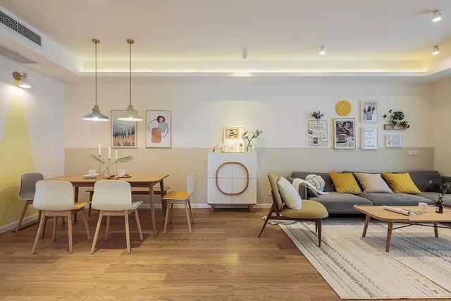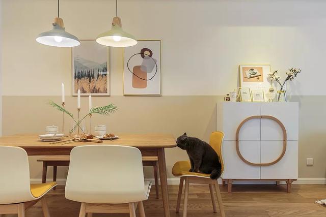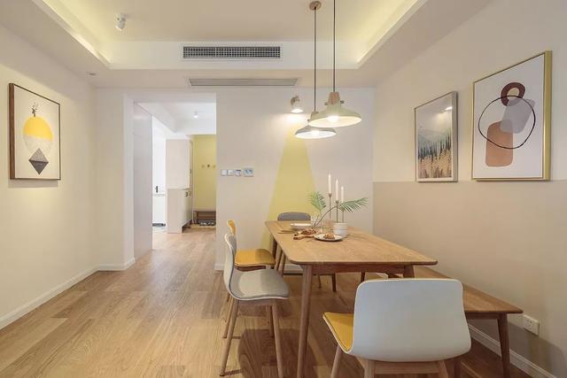 ▲餐廳背景墻掛上兩幅簡(jiǎn)約的裝飾畫,搭配原木餐桌,灰黃配座椅,還有兩張灰黃配的吊燈,呈現(xiàn)出一個(gè)溫馨自然的空間感。