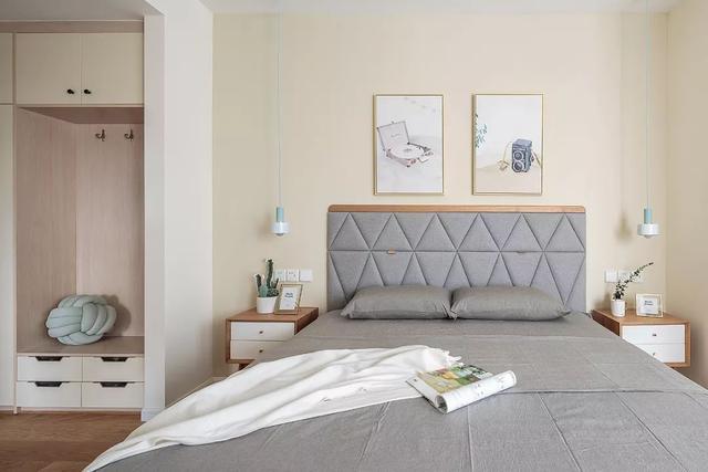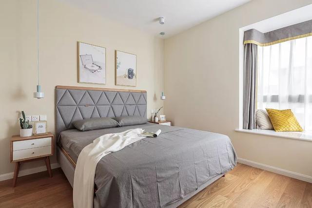 ▲主臥暖色調(diào)的墻面空間基調(diào),搭配灰色布藝床,床的靠背是舒適的布質(zhì),墻面兩幅簡(jiǎn)約裝飾畫,還有2個(gè)木色柜身+白色門的床頭柜,還有情調(diào)舒適的休閑飄窗,簡(jiǎn)單的空間布置營(yíng)造出溫馨舒適的畫面。