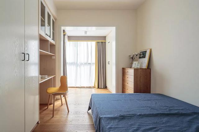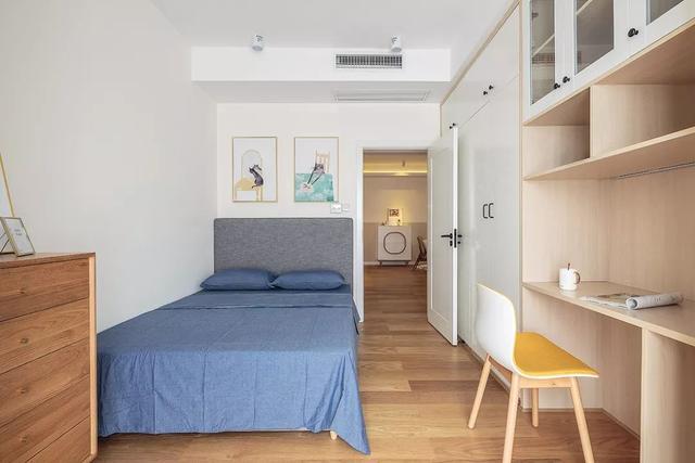 ▲次臥通透的布局還床與書桌衣柜布置成2排,木質(zhì)與白色的空間色調(diào),搭配藍(lán)灰色的床,帶來(lái)舒適自然的空間感。