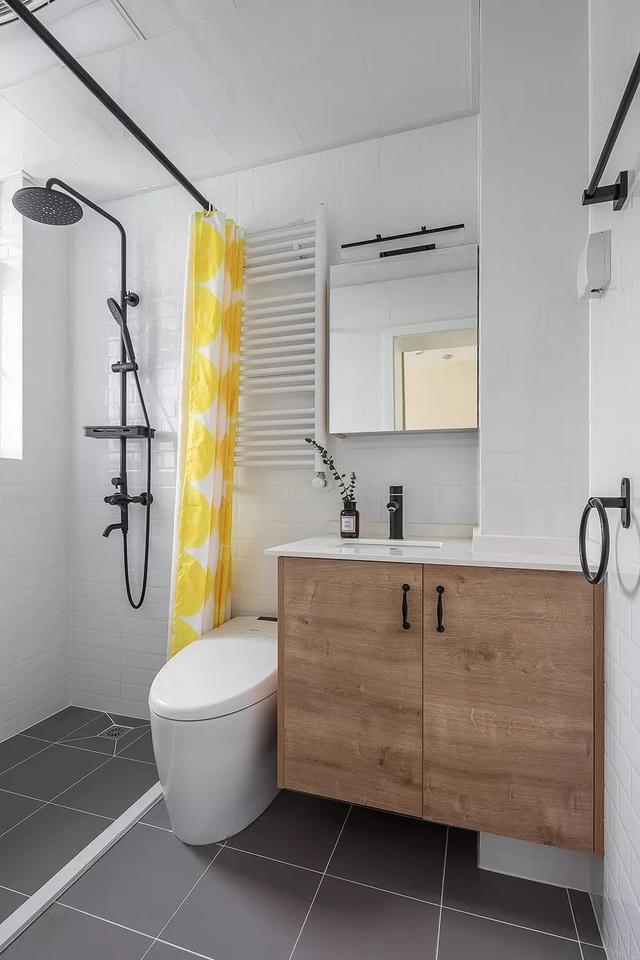 ▲衛(wèi)生間在灰色地面+白色墻面,搭配木質(zhì)的洗手盆,再以浴簾作為隔斷,整個(gè)空間緊湊舒適而又實(shí)用精致。
