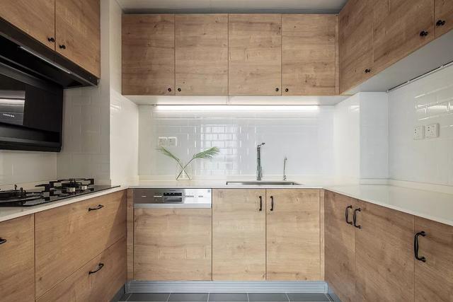 ▲U形格局的廚房,在灰色地磚基礎(chǔ),搭配木質(zhì)櫥柜面板與白色的墻面磚,營(yíng)造出一個(gè)文藝舒適的烹飪空間,做飯的心情都顯得輕松閑適。
