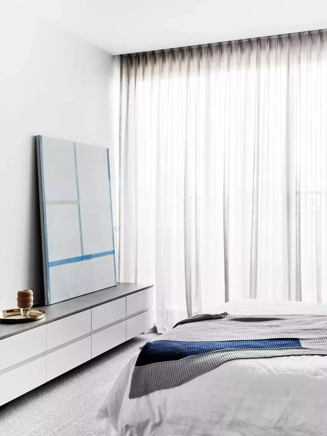 而北向臥室的窗簾就相對(duì)來說隨意一些,布質(zhì)垂直簾,透光性較好的風(fēng)琴簾、卷簾都可以,只要注意控制光線、保護(hù)隱私即可。