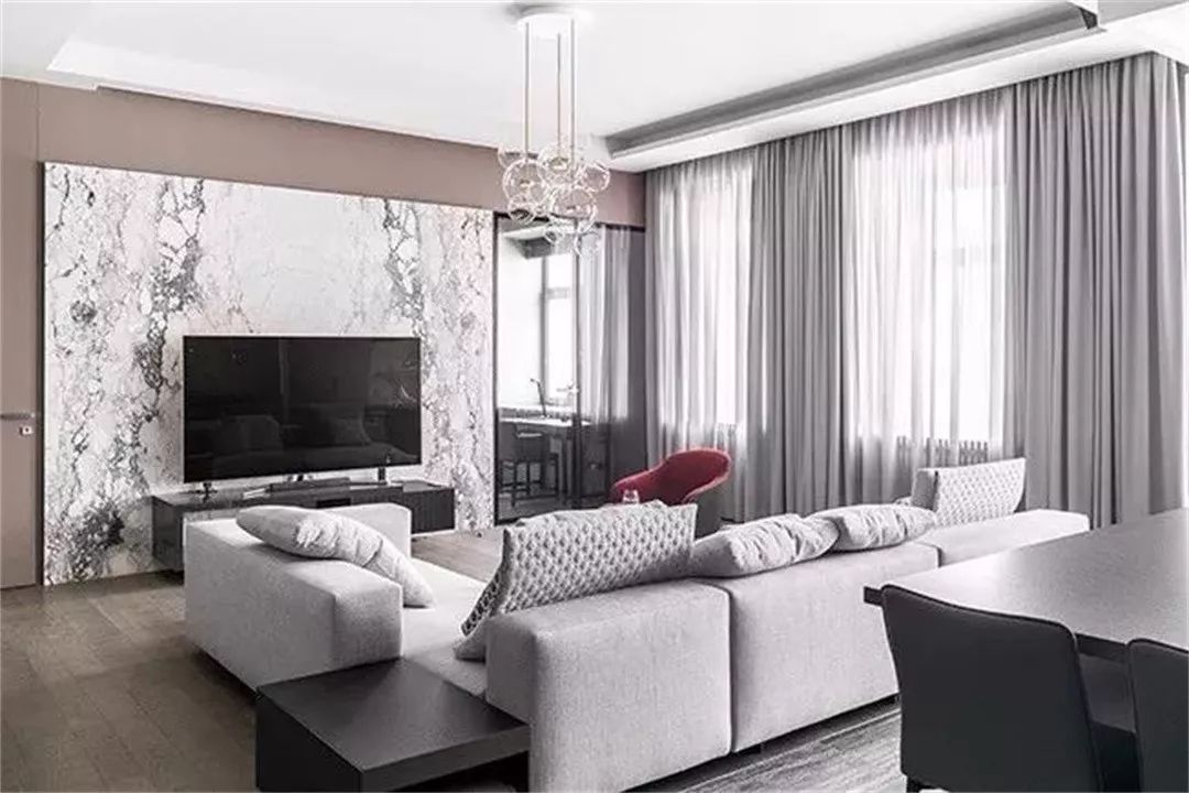 對(duì)于喜歡窩在沙發(fā)上看電視,將客廳主要當(dāng)成視聽區(qū)使用的家庭來說,客廳的光線不宜太強(qiáng),以免影響到視聽效果,建議選擇具有擋光、隔熱功能的厚棉麻或滌綸材質(zhì)的窗簾。