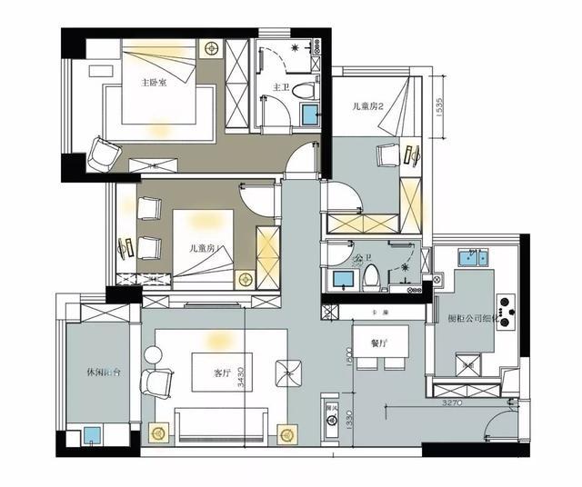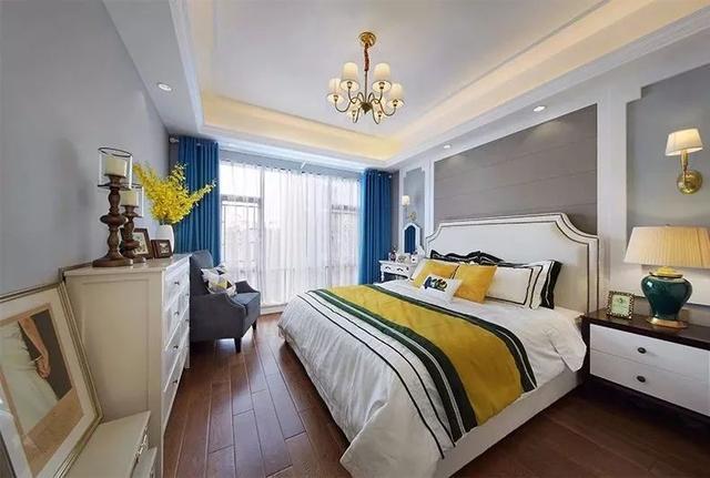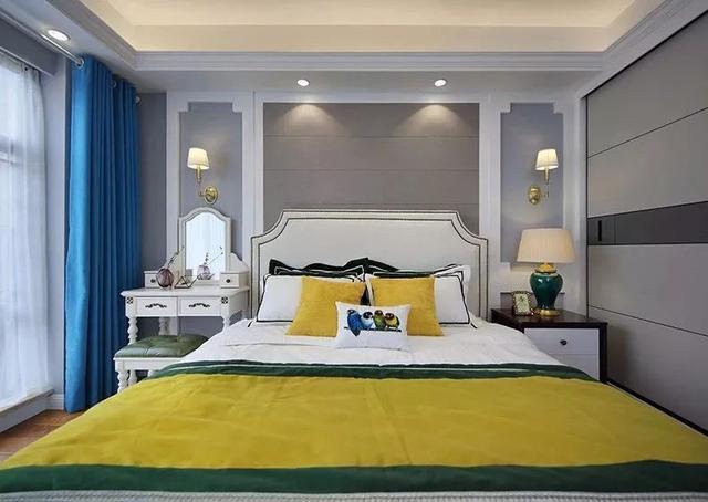 ▲臥室床頭背景墻以造型邊框分成3端,中間灰色+兩側(cè)藍(lán)色,搭配兩色的床單與細(xì)節(jié)軟飾,以藍(lán)色窗簾營造出靜謐的空間,置身其中感覺安靜而又暖心舒適。