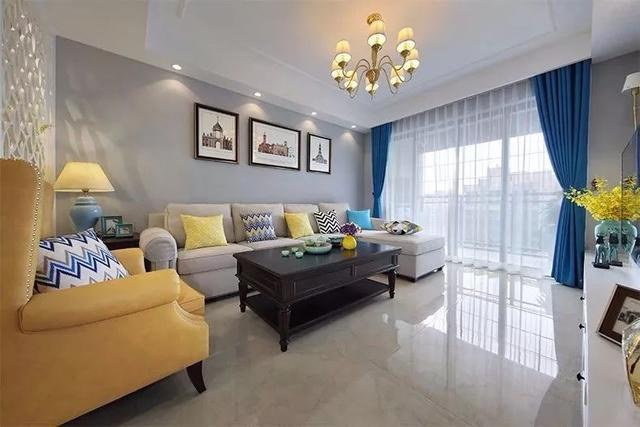 ▲客廳藍(lán)色+白色紗簾的窗簾,結(jié)合黃色單人沙發(fā),還有一盞銅質(zhì)吊燈,整個空間給人以活潑鮮艷的雅致感。