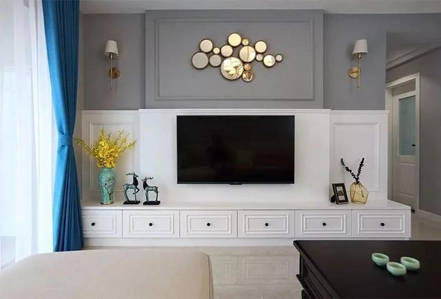 ▲電視墻底部白色+上部灰色的邊框造型,電視機上方掛一組銅鏡,兩側(cè)分別是壁燈,定制電視柜帶有抽屜,顯得非常實用,電視柜臺面擺著雅趣的擺飾品,帶來了檔次的溫馨。