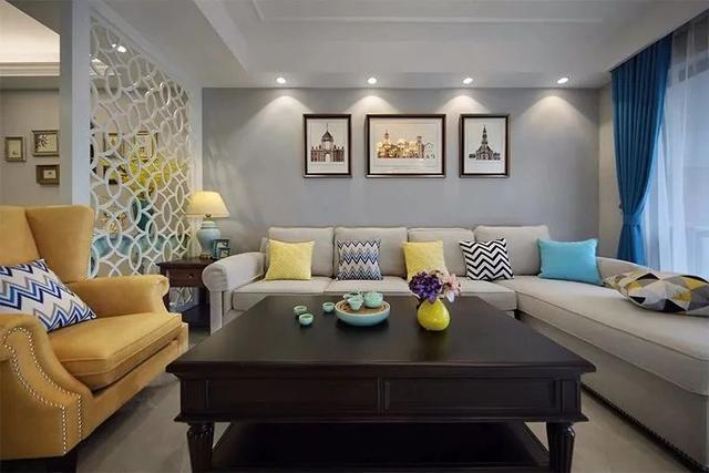 ▲沙發(fā)墻掛上三幅復(fù)古建筑畫,美式布藝沙發(fā)還有鮮艷的抱枕,搭配上深色實木茶幾,營造出一個端莊而又活潑雅致的空間感。