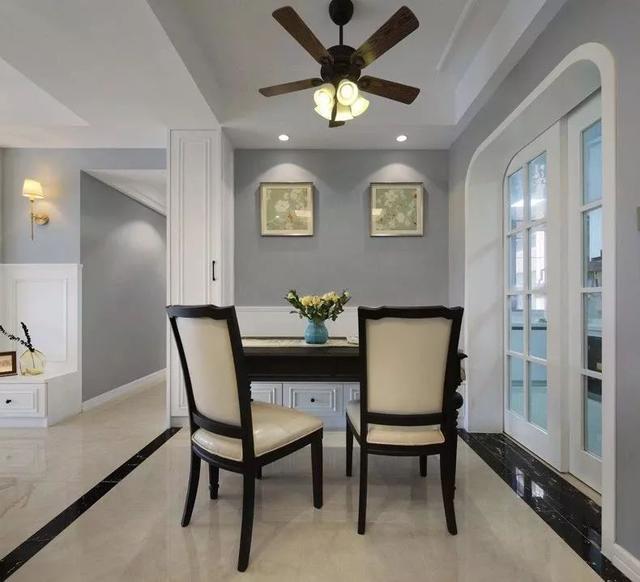 ▲餐廳背景墻與電視墻類似的下白上灰搭配,卡座式的設(shè)計結(jié)合木質(zhì)餐桌,還有兩張實木軟墊的餐椅,在復(fù)古調(diào)的風(fēng)扇吊燈搭配下,營造出一個端莊優(yōu)雅的用餐空間。