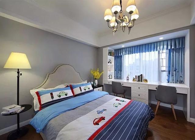 ▲兒童房整體空間以簡約為主,靠窗裝上一個長長的書桌,做成雙人位的書桌,提供了充足實用的作業(yè)寫字空間,搭配彩色車子圖案的床單,顯得童趣自然。