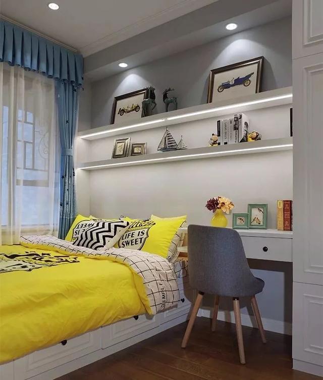 ▲書房空間較為緊湊,以榻榻米+書桌的設(shè)計,床頭上方的兩道擱板貫穿到書桌上方,作為書架與展示架,在亮色活躍的床單軟裝搭配下,顯得活力優(yōu)雅。
