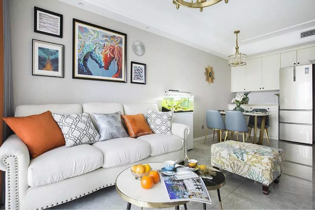 采取一組小幅的裝飾畫,把沙發(fā)墻大面積掛上,這種情況可以容納各式各樣的裝飾畫,讓沙發(fā)墻更加豐富多樣。