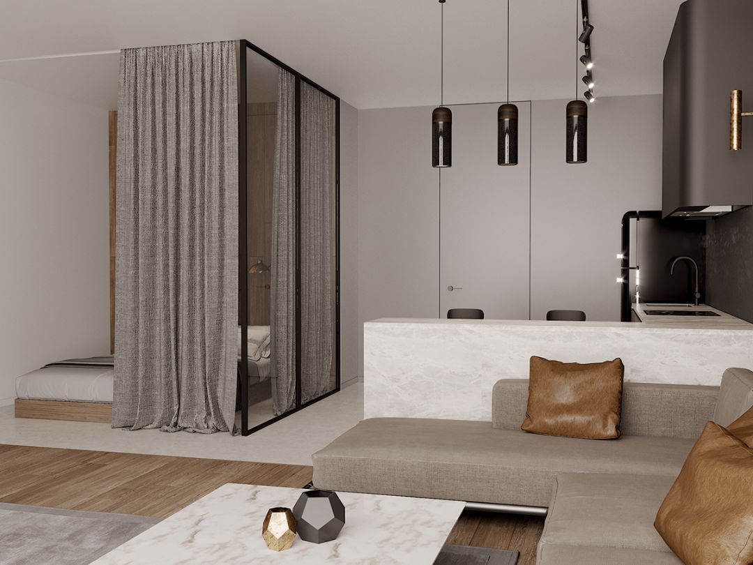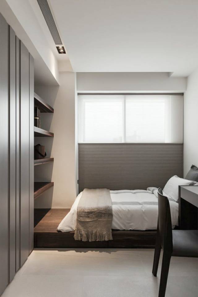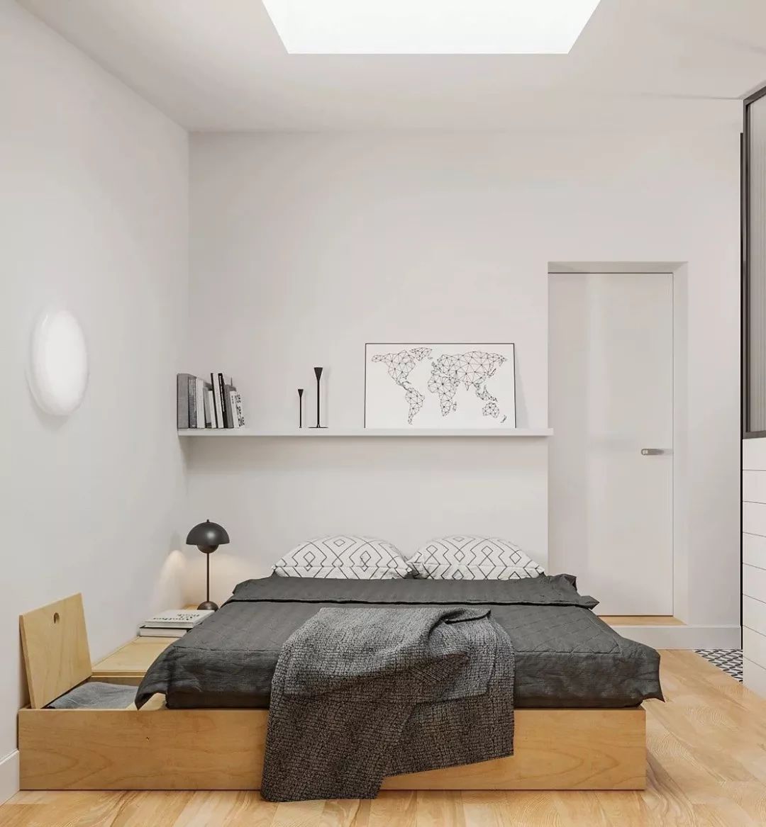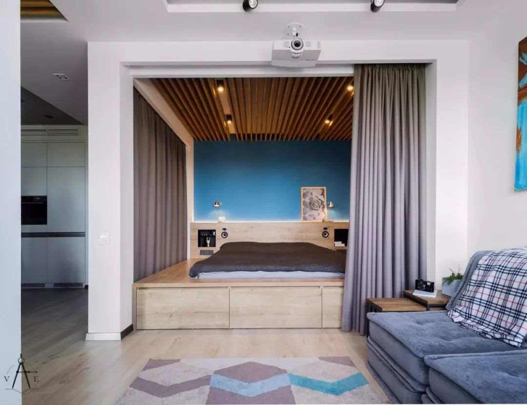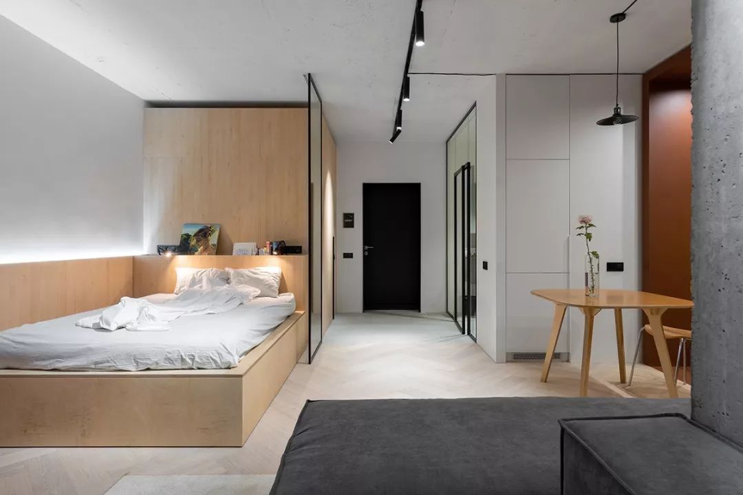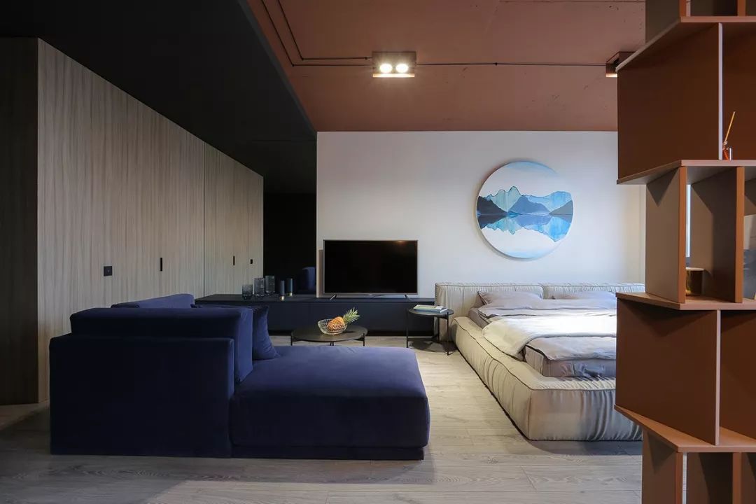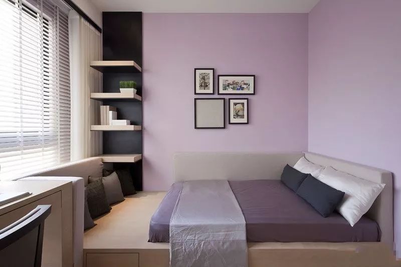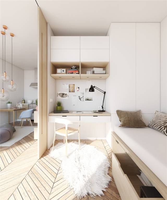 當(dāng)然,像下面這樣將整個雙人床與沙發(fā)區(qū)、學(xué)習(xí)區(qū)整合起來的設(shè)計,也能充分利用每一寸空間,創(chuàng)造一種輕松舒適的生活氛圍。