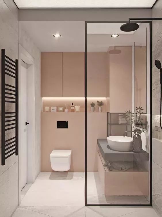 如果不喜歡大面積的粉色調(diào),你也可以進行局部裝飾,再利用簡潔利落的黑色線條及隱藏式燈光稍加點綴,就能讓衛(wèi)生間成為家中的一大亮點,更增添了時尚優(yōu)雅的氣質(zhì)。