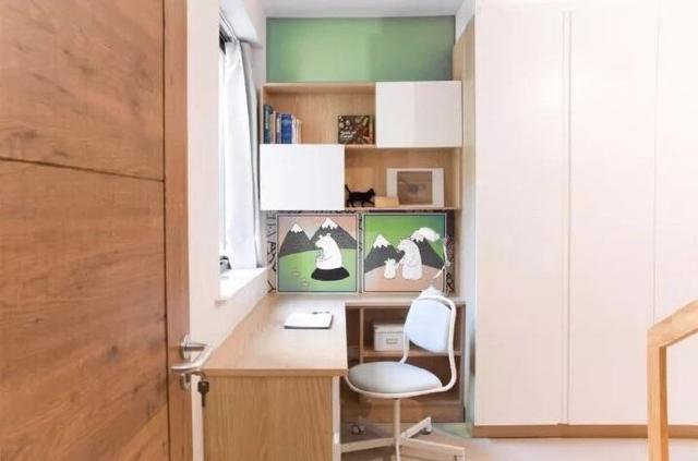 升級(jí)版的兒童房。一體式的定制書(shū)桌+衣柜,搭配榻榻米,收納空間充足,而且拿取東西一目了然。亮色的軟裝,也體現(xiàn)了裝修的精致。