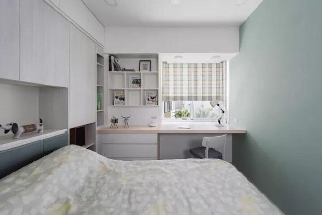 大一點(diǎn)的臥室,可以選擇這種靠窗邊的一體式設(shè)計(jì),懸空的L型書(shū)桌,上下方都有充足的空間置物收納。
