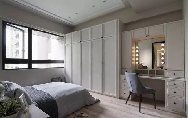 想要與眾不同又格調(diào)十足,可以考慮用定制梳妝臺(tái)取代書(shū)桌,旁邊定制做到頂?shù)囊鹿?,可以補(bǔ)充主臥的收納空間。這樣的操作,讓采光和視野也能變得很好。
