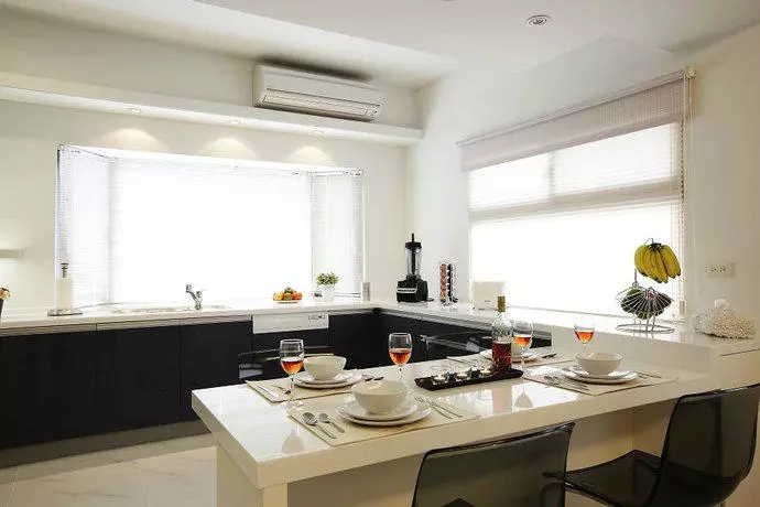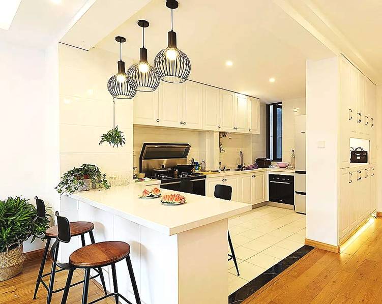 2、如果空間不大,可以采用L形開(kāi)放式廚房,在櫥柜一端做了延伸的小吧臺(tái),在空間上做了分隔。