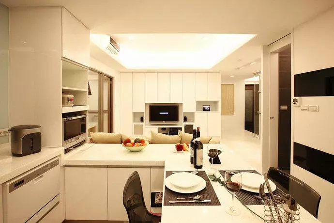 3、這樣不僅能將餐廳與廚房合二為一,達(dá)到延展空間的效果,形成了一個(gè)溫馨而實(shí)用的用餐區(qū)域,而且餐臺(tái)上可以裝置燈光,增添裝飾效果 ,浪漫又實(shí)用。