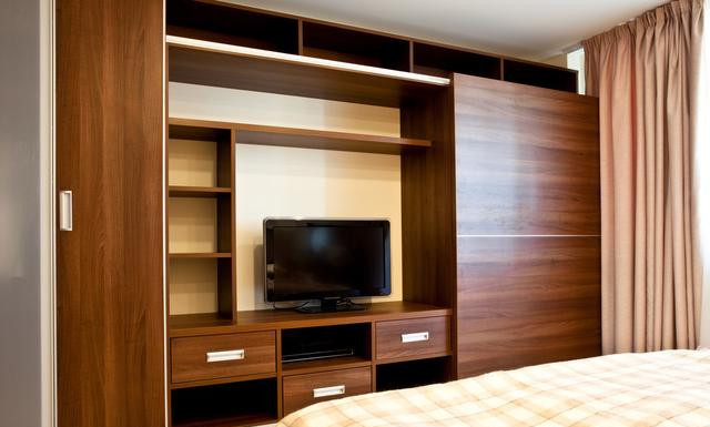 硬邦邦的家電若是直接放在墻面上,會讓其顯得非常突兀,建議利用氣死妙想把電視柜給隱藏起來。例如,可以把電視柜個衣柜設(shè)計成一體式。這樣設(shè)計一道彈性門板來遮擋,平時只需要闔上門板就能保持衣柜的完整性。若是臥室空間比較大,可以在床尾的那面墻邊擺放電視柜,配飾上一張休閑椅,打造成一個小居室。