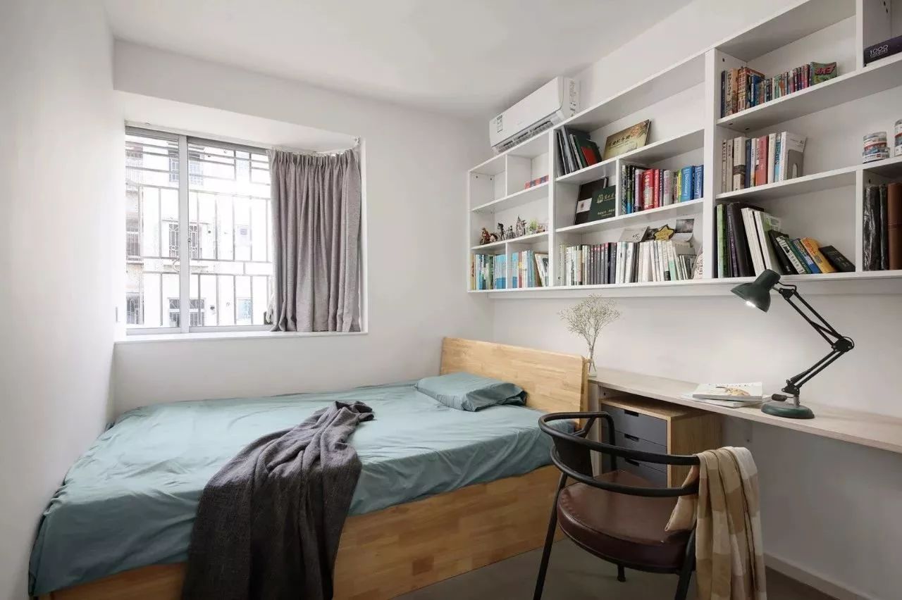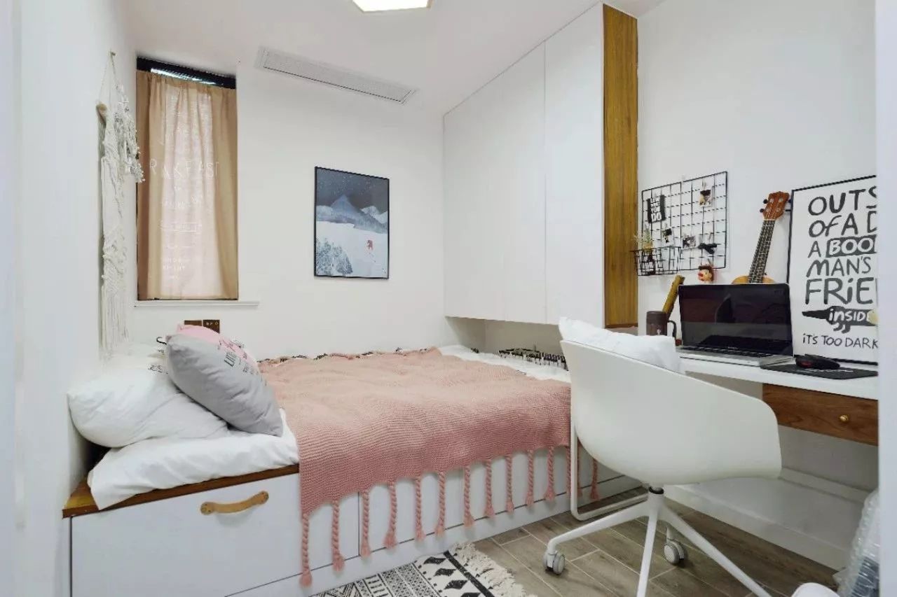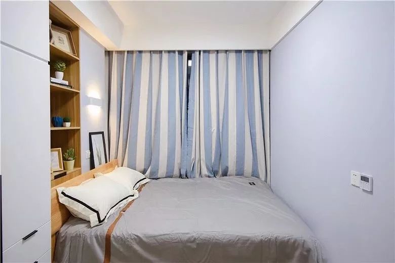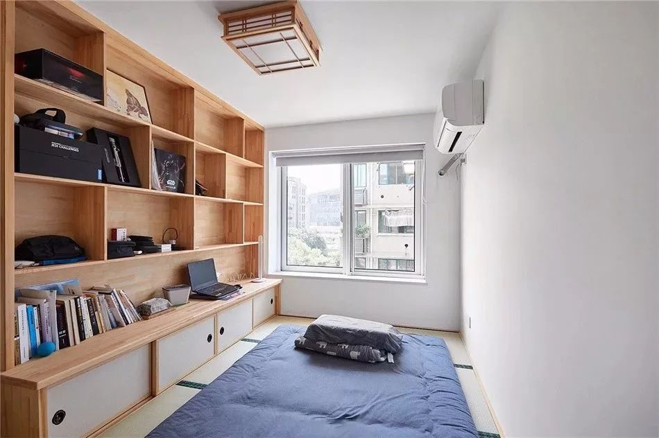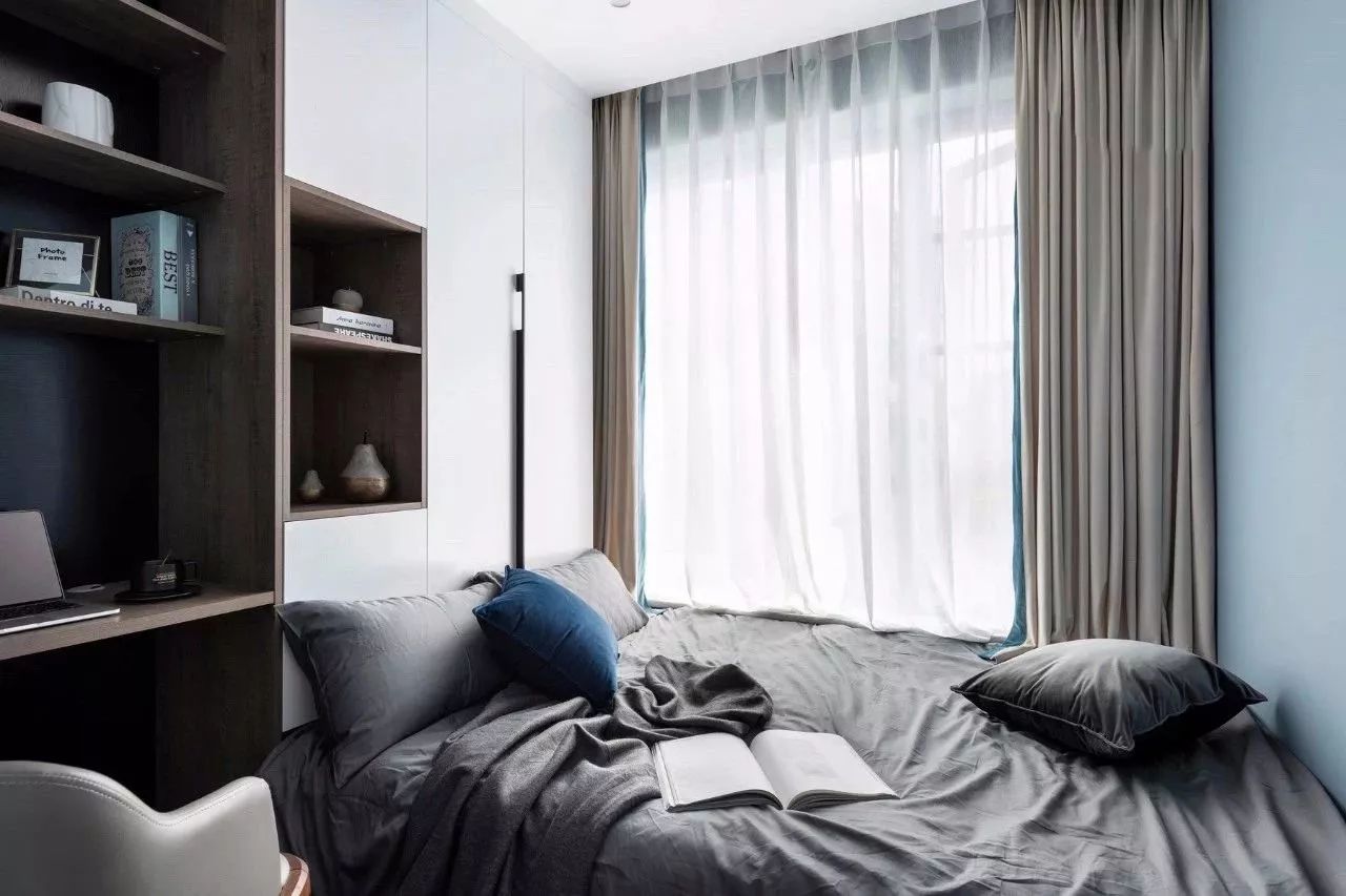 一些睡慣了床的人,可能會(huì)覺得榻榻米不夠透氣,睡著不是很舒適,所以還是堅(jiān)持要做床的,這個(gè)時(shí)候想要利用好小臥室,只能是緊湊地布置,或是取消床頭柜、或是換個(gè)小店的床。