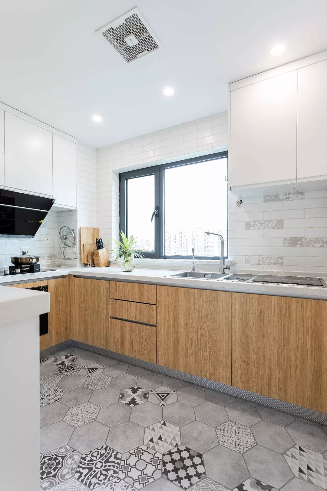 ▲ 開放式廚房通過中島臺(tái)和餐廳進(jìn)行隔斷,地面由六邊形花磚和木地板進(jìn)行完美拼接過渡,令空間增色不少。