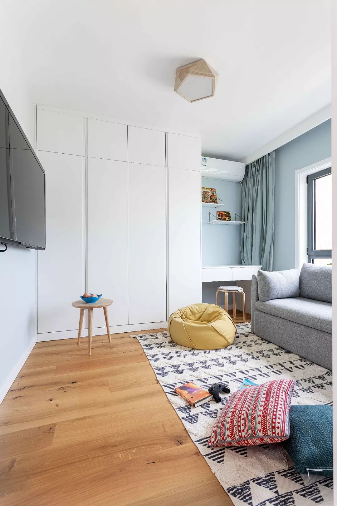 ▲ 打破了常規(guī)的臥室設(shè)計(jì),沒有了常規(guī)的床,取而代之的是沙發(fā)床,所以這里的次臥設(shè)計(jì)更像是一個(gè)休閑區(qū),將來(lái)也是與孩子的親子活動(dòng)區(qū)。