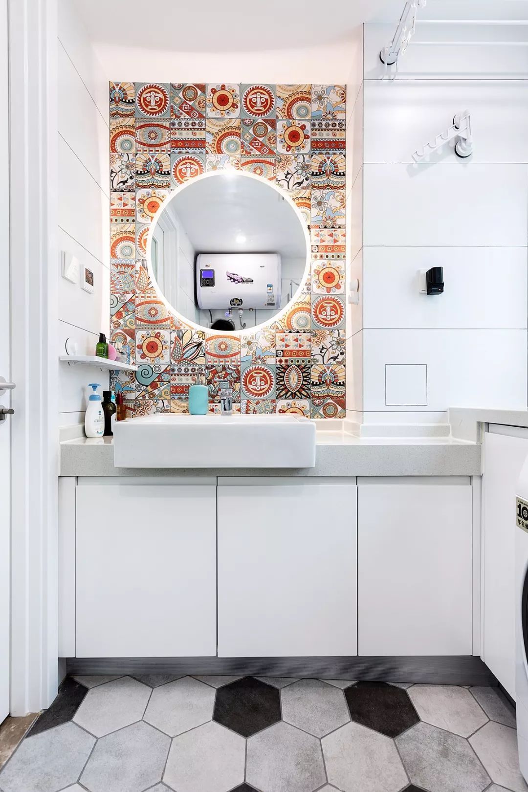 ▲ 洗手盆的位置比較窄,半嵌式的臺(tái)上盆很好地解決了這個(gè)問題。墻面彩色花磚圖案精致,配合鏡燈打造出了極具感染力的空間效果。