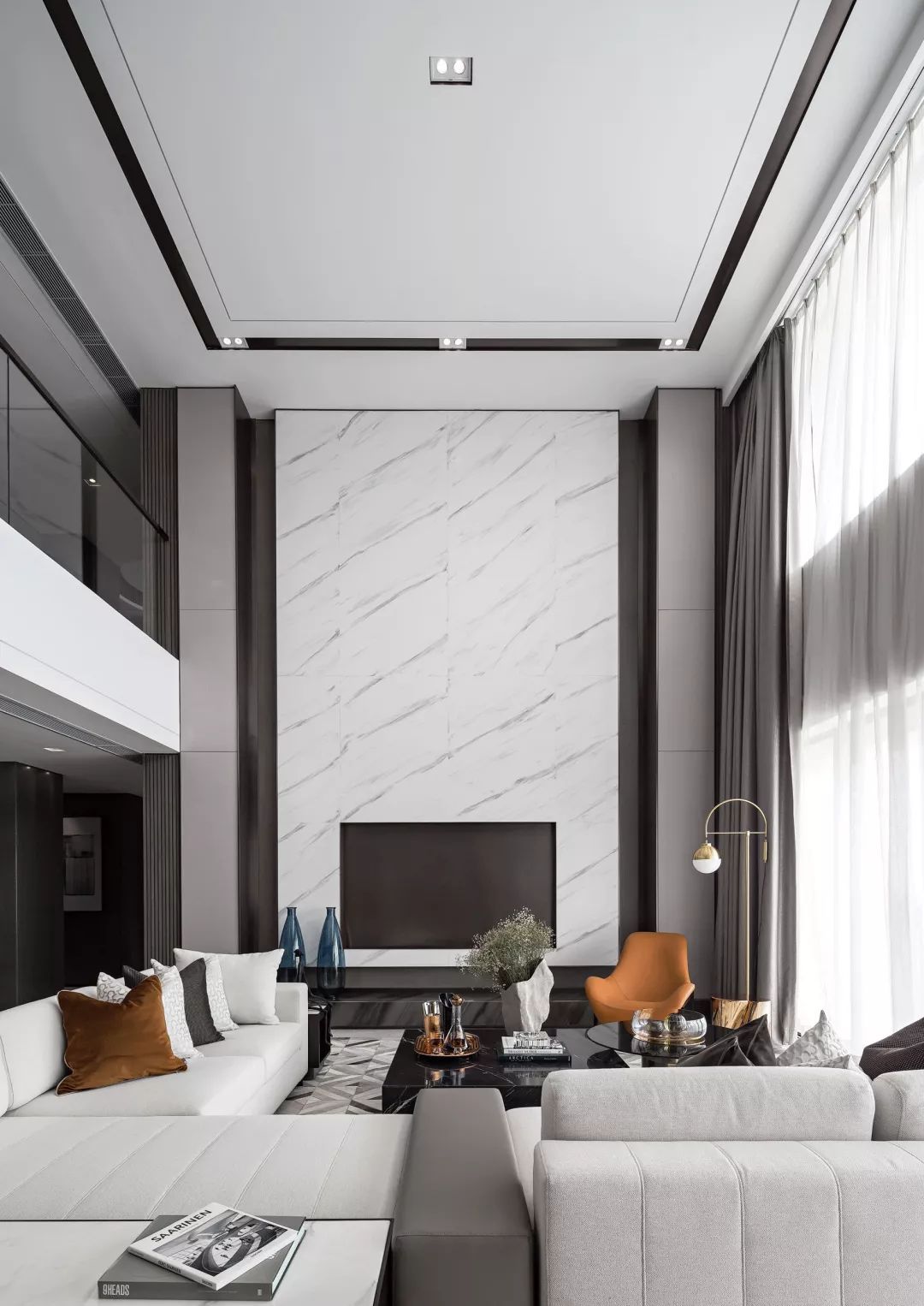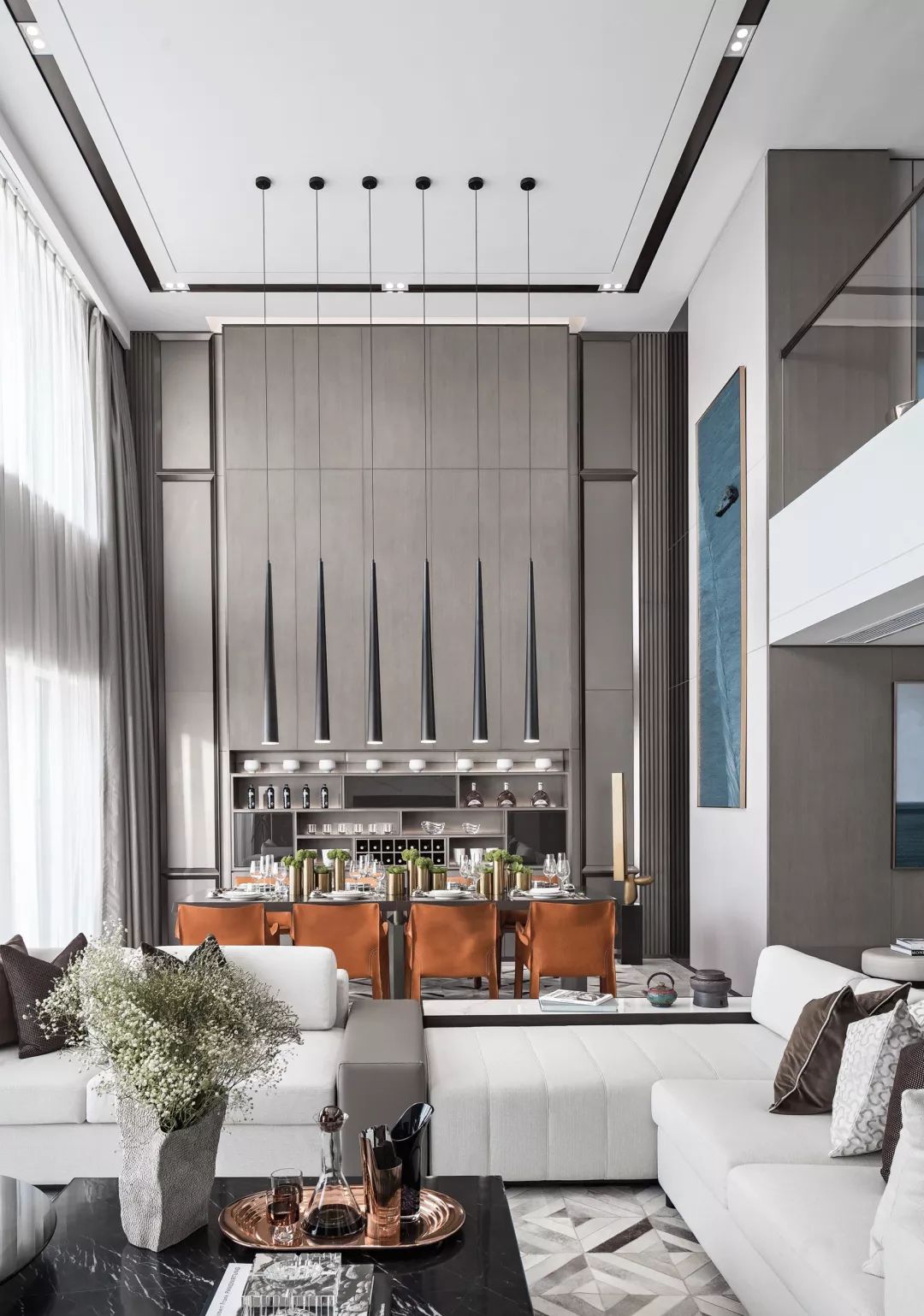挑高空間設(shè)計吊頂,一般需要搭配燈飾以及單層或多層裝飾線條進行修飾,巧妙地提升空間層次。