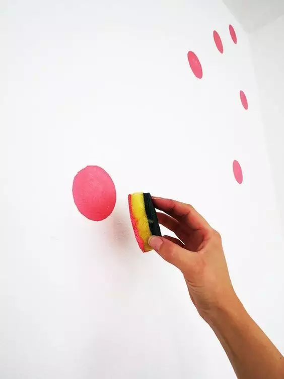 或者百潔布粘上顏料,一個(gè)一個(gè)印在墻面上。覺(jué)得油漆量太多、氣味重、價(jià)格高的,可以選擇用性價(jià)比高的丙烯顏料、水性漆。