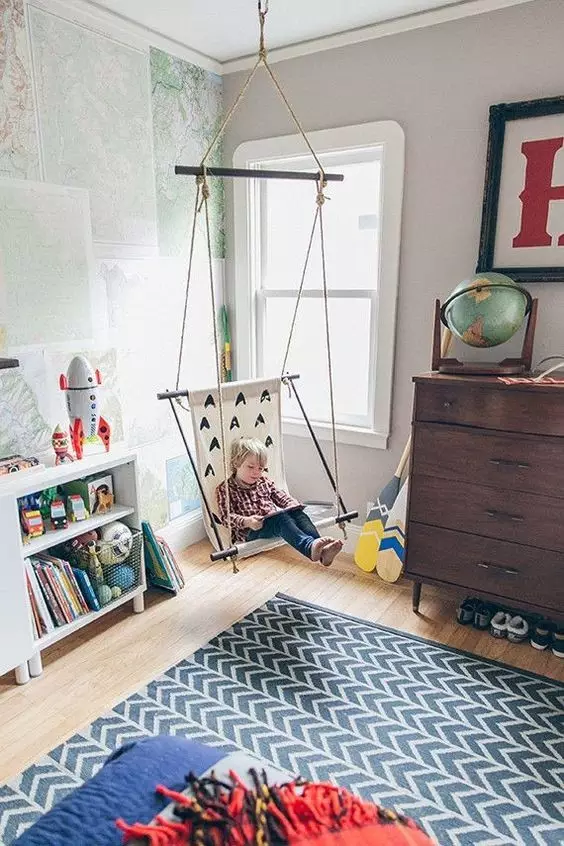 在墻面上弄書(shū)架。這樣擺放書(shū)面朝外而不是書(shū)脊朝外,更能吸引小朋友有一檔綜藝節(jié)目的三胞胎,在生活中總是能說(shuō)出能家長(zhǎng)驚訝的詞語(yǔ)。后來(lái)才知道原來(lái)都是在書(shū)上學(xué)到的。在房間做一個(gè)秋千椅也是個(gè)不錯(cuò)的選擇。小孩大人都適用,在秋千椅上邊晃邊看書(shū)總好過(guò)躺在床上玩手機(jī)吧~