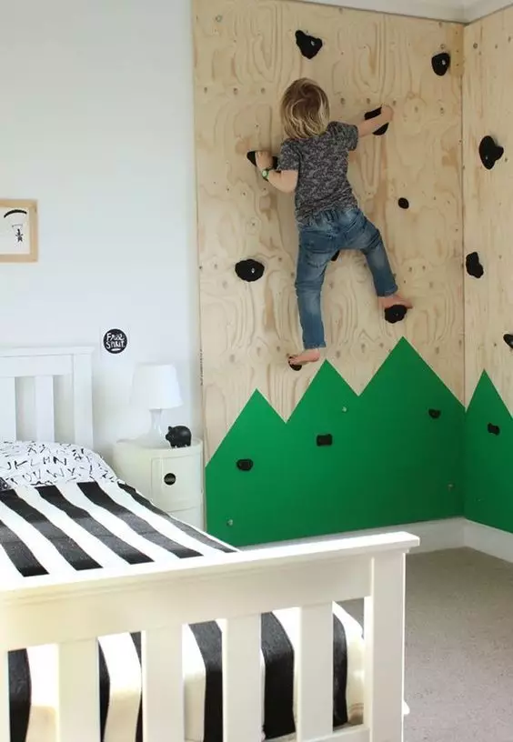 孩子在逐漸成長(zhǎng)的過(guò)程中會(huì)慢慢明確自己的喜好。如果喜歡攀登的話,利用一面墻做攀登活動(dòng)也很不錯(cuò)。等爬不上了說(shuō)不定還能用來(lái)掛衣服啥的。