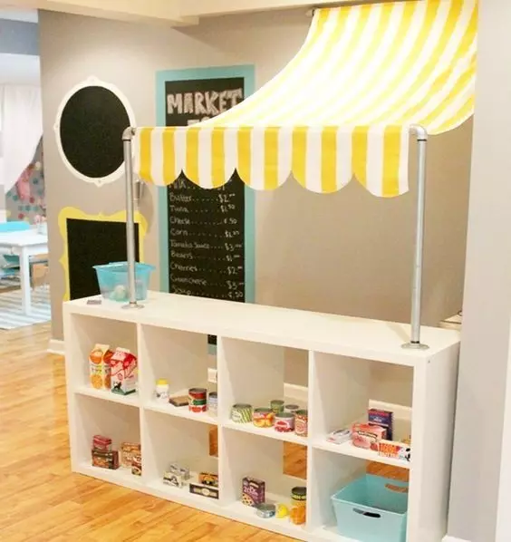 在置物架上搭個(gè)小帳篷,一小塊黑板的位置就是當(dāng)鋪買(mǎi)賣(mài)了。綜藝節(jié)目里面有過(guò)讓小孩出去購(gòu)物的環(huán)節(jié),錢(qián)都是隨便給的,幾乎都沒(méi)有正確的金錢(qián)意識(shí)。所以從小培養(yǎng)孩子正確購(gòu)物、金錢(qián)意識(shí),也是非常重要的。