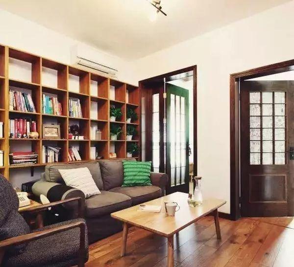 沙發(fā)后面的置物架是專門定制的,剛好充分利用了客廳的墻面空間,貼合著墻面齊天花板高,又設(shè)計(jì)出多種收納空格,這樣這樣的大型書柜是非常實(shí)用的。