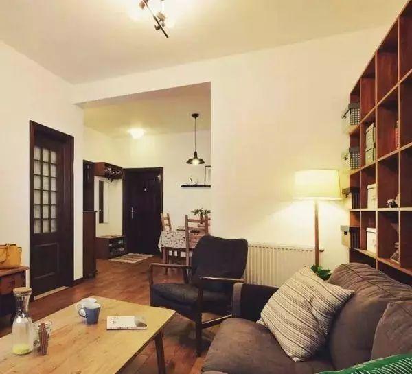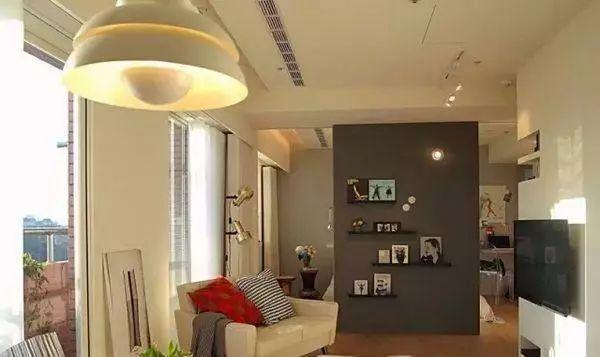設(shè)計(jì)一個(gè)半寬隔斷墻壁把客廳和臥室之間隔斷,這樣的設(shè)計(jì)占用空間小,而且對(duì)空間光線的影響小。隔斷墻也不要浪費(fèi),在墻面上掛壁置物架做收納,可以收納些相框擺件,也增加了空間的裝飾效果。