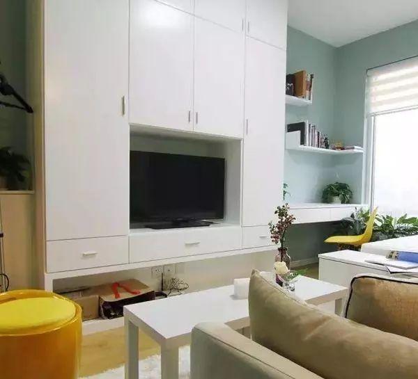 面積小的客廳想增加空間那就充分利用電視背景墻吧,設(shè)計(jì)頂天立地型的電視背景墻柜,中間留出空檔掛電視,四周的大柜都是收納柜,這樣客廳里所有雜亂物品都能收納到位,多完美呀。